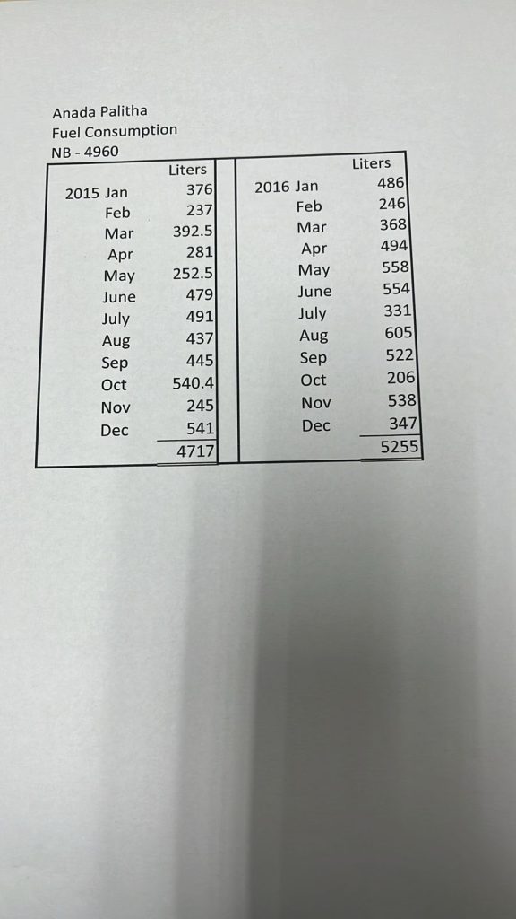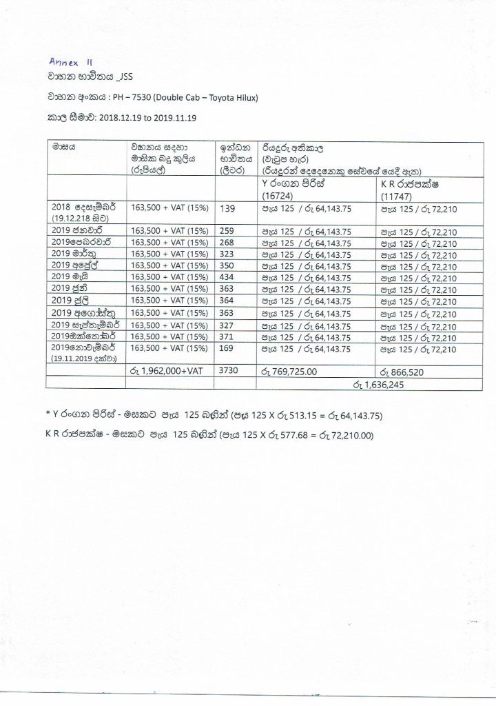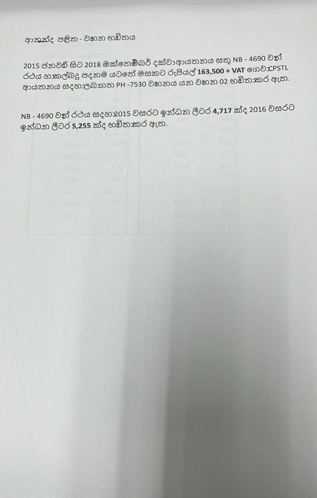 එමෙන්ම එම වෑන් රථය සඳහා 217 වසරේ මාස 11 සඳහා ලීටර් 5363ක් සහ 2018 වසරේ මාස 6ක් සඳහා ලීටර් 2346ක් ද භාවිතා කර ඇති බවත් හෙළිවේ.
