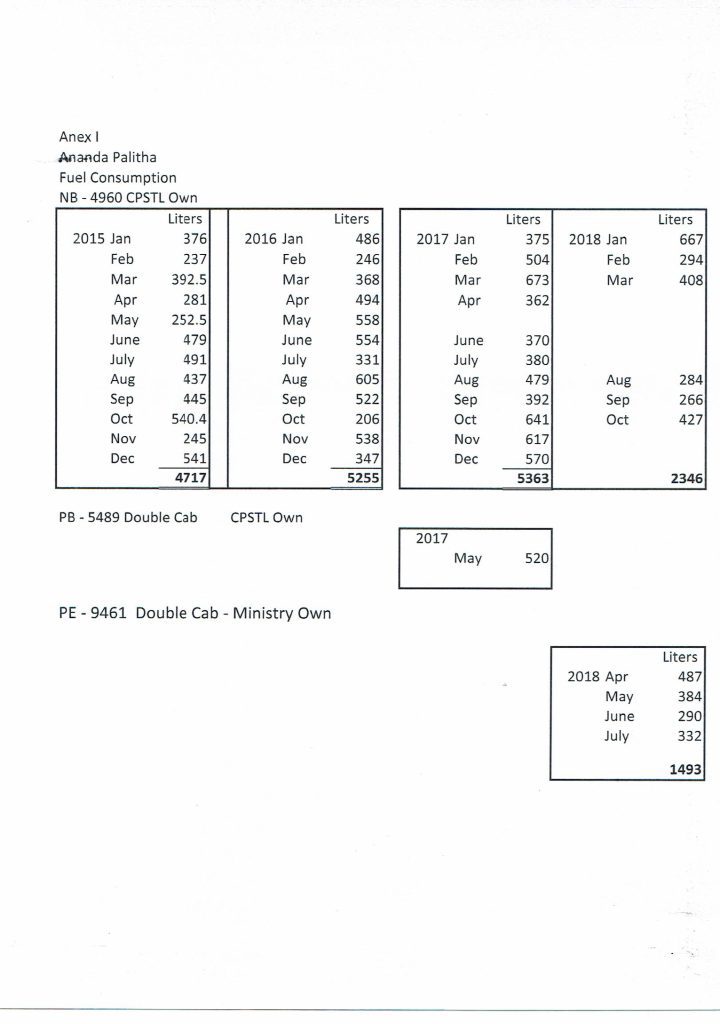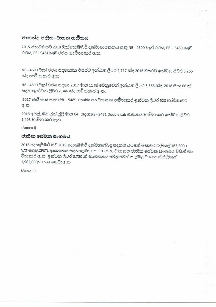 2015 ජනවාරියේ සිට 2018 ඔක්තෝබර් දක්වා ආයතනය සතු NB-4690 වෑන් රථය, PB – 5489 කැබ් රථය සහ PE – 9461 කැබ්රථය ඔහු විසින් භාවිතයට ගෙන ඇති බවත්, NB-4690 වෑන් රථය සඳහා 2015 වසරේ ඉන්ධන ලීටර් 4717ක් ද 2016 වසරේදී ලීටර් 5255ක් ද භාවිතා කර ඇති බවත් වාර්තා වේ.