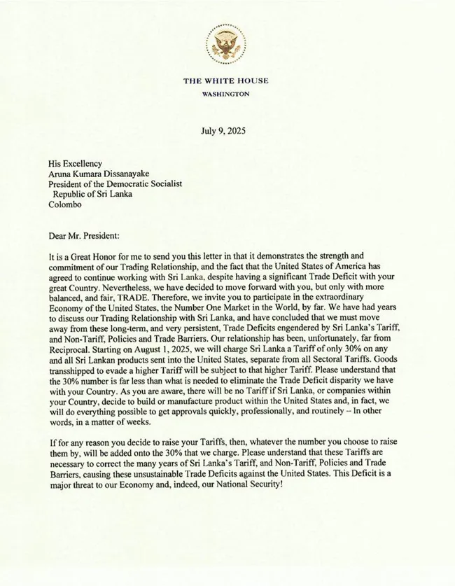 ධවල මන්දිරය නිවේදනයක් නිකුත් කරමින් සඳහන් කළේ, අමෙරිකානු ජනාධිපති ඩොනල්ඩ් ට්‍රම්ප් විසින් ශ්‍රී ලංකාව විසින් සිදුකරන අපනයන සඳහා 30%ක අනෝන්‍ය තීරුබදු පැනවිමට තීරණය කළ බවයි.