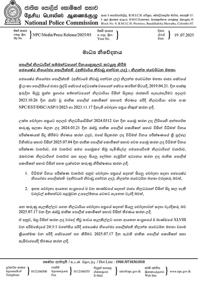 ජාතික පොලිස් කොමිසම විසින් මෙම තීරණය ගත් බවයි සඳහන්.